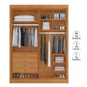 Caracter?sticas: 4 Gavetas com puxadores 4 Nichos 4 Portas 4 Prateleiras Cabideiros em alum?nio, suporta 7kg Cada prateleira suporta 10Kg Cada gaveta suporta 5Kg Corredi?as telesc?picas Dobradi?a press?o 35mm Estrutura em MDF 15mm Puxador em madeira