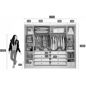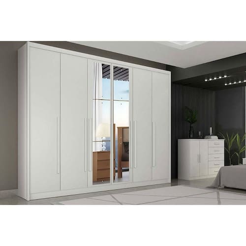 Tipo de Cabideiro - Aéreo Material dos Cabideiros - Cabideira Metálico Tipo de Porta do Guarda-Roupa - Portas de Bater - Portas de Correr Material das Portas - Portas em MDF Tipo de Dobradiças - Dobradiças Metálicas Quantidade de Portas - 6 Portas de Abrir Quantidade de Portas com Espelho - 2 Portas com Espelho Tipo de Espelho - Espelho Externo Quantidade de Espelhos - 2 Espelhos Material das Gavetas - Gavetas em MDF Tipo de Corrediça - c/ Corrediças Telescópicas Quantidade de Gavetas - 8 Gavetas Material das Prateleiras - Prateleiras em MDF Quantidade de Prateleiras - 2 Quantidade de Nichos - 10 Nichos
