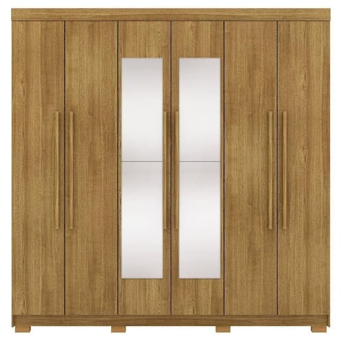 Este guarda-roupa casal com espelho conta com 6 portas com dobradiças metálicas que garantem abertura e fechamento suaves e duradouros. Possui 2 gavetas espaçosas com corrediças metálicas, perfeitas para acomodar roupas dobradas e acessórios com praticidade. Estrutura em MDP de 15mm (Laterais em MDP de 12mm e fundo em MDF de 3mm). Os 2 cabideiros de alumínio oferece mais firmeza para suas roupas penduradas, suportando o uso diário sem deformar. Contem puxadores em MDF revestido, que trazem um toque moderno ao visual, combinando perfeitamente com qualquer ambiente. Para maior estabilidade e elevação do móvel, o guarda-roupa conta com pés retangulares, que além de funcionais, dão um acabamento elegante à peça, acompanha espelho. Este móvel chegará na sua casa separado em 04 volumes.