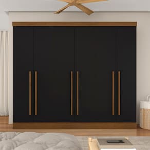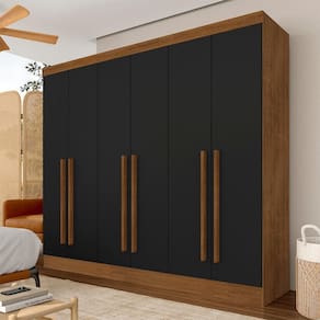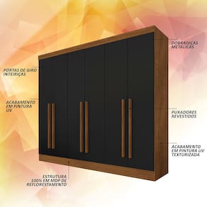 Detalhes Técnicos Medidas do Produto Montado: A: 200cm x L: 180cm x P: 45cm - MDP 12mm e 15mm - Acabamento em Pintura UV - Tonalidade: Freijó/Preto Fosco - Puxadores: MDF 18mm - Cabideiros: Em Alumínio - Gavetas com Corrediças Metálicas - Prateleiras e Gavetas suportam até 5kg distribuídos