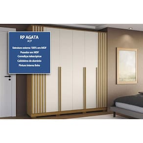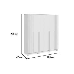 Material do Calceiro - Calceiro Metálico Tipo de Cabideiro - Aéreo Tipo de Porta do Guarda-Roupa - Portas de Bater Material das Portas - Portas em MDF Tipo de Dobradiças - Dobradiças Metálicas Diferenciais das Portas - Portas Ripadas Quantidade de Portas - 6 Portas de Abrir Material das Gavetas - Gavetas em MDF Tipo de Corrediça - c/ Corrediças Telescópicas Quantidade de Gavetas - 4 Gavetas Tipo dos Pés - MDF Quantidade de Pés - 8 pés Material das Prateleiras - Prateleiras em MDF Quantidade de Prateleiras - 2 Quantidade de Nichos - 8 nichos