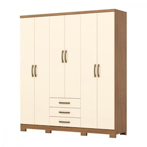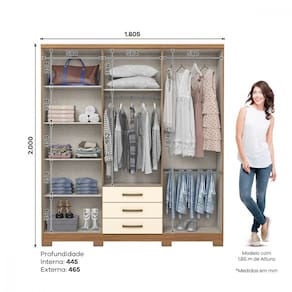 Características: Cabideiro de madeira revestido Gavetas com corrediças metálicas Pés em ABS Puxadores em ABS Estrutura em 12 e 15mm 6 Portas 3 Gavetas Prateleira suporta até 8kg Gaveta suporta até 3kg Calceiro