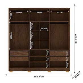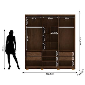 Com seis portas e quatro gavetas espaçosas, oferece amplo armazenamento para roupas, acessórios e objetos pessoais.