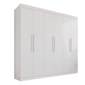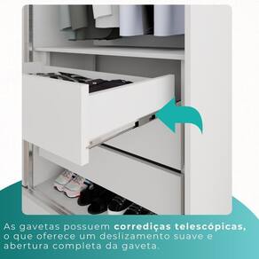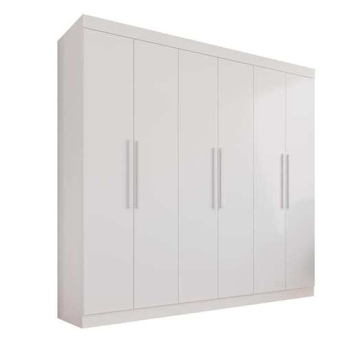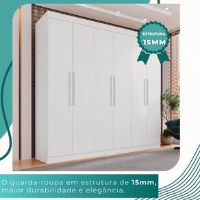 Estilo: modernoMaterial principal: MDP 15 mmEspessura do fundo e fundo da gaveta: 3 mmAcabamento: pintura texturizada UVEscala de brilho: foscaPortas: 6 portas de bater com puxador externoTipo de dobradiça da porta: metálicaNúmero de prateleiras: 8Peso suportado por prateleira: 3 kgNúmero de gavetas: 4 gavetas internasTipo de corrediça da gaveta: metálica telescópicaPeso suportado por gaveta: 5 kgNúmero de cabideiros: 4Sistema de montagem: parafusos e cavilhas