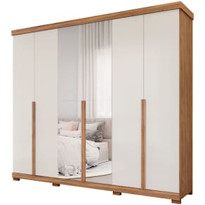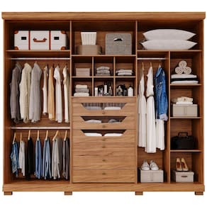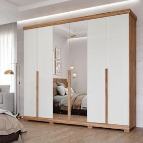 Com 6 portas e 6 gavetas, além de nichos, prateleiras e cabideiros, é ideal para acomodar roupas, calçados e acessórios com facilidade.