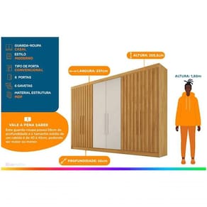 O Guarda-Roupa Casal Ripado Potente da Móveis Europa é uma ótima opção para guardar tudo o que você precisa com amplo espaço e organização. Produzido com design moderno e funcional em madeira 100% MDF de alta qualidade, com revestimento verniz UV e acabamento semi-brilho. São 6 portas convencionais com dobradiças metálicas, 6 gavetas internas com puxadores embutidos e 8 nichos para você organizar tranquilamente bolsas, sapatos, acessórios e outros objetos pessoais. Duas das gavetas possuem chave para guardar ítens de valor com segurança. As prateleiras são removíveis e ele ainda conta com compartimento para malas e roupas de cama na parte superior. Produto na cor Peroba e Off White.MarcaMóveis EuropaReferência17335-211ModeloPotenteLinhaRipadoTamanhoCasalQuantidade de Portas6 PortasTipo de PortaConvencionalQuantidade de Gavetas6 GavetasMaterial da EstruturaMDFEstiloModernoMaterialMDFRevestimentoVerniz UVAcabamentoSemi-brilhoSistema de AberturaDobradiças MetálicasGavetasInternasPeso Suportado por Gaveta5kgPrateleiras3 InternasPeso Suportado por Prateleira5kgQuantidade de Nichos8 NichosComplexidade de MontagemAltaCorPeroba e Off WhitePeso do Produto261kgPeso do Produto com Embalagem270kgDimensões do ProdutoLargura: 237cm Altura: 250,5cm Profundidade: 56cmPrazo de Garantia03 meses de garantia legal.Conteúdo da Embalagem1 Guarda-Roupa