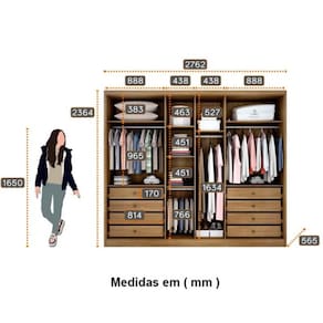 Produzido 100% MDF; Colunado em 25mm; 06 portas com dobradiças de pressão de 25mm; Puxadores com acabamento amadeirado; Espaço para longo; 08 gavetas internas com puxadores e corrediças telescópicas; Cabideiro e calceiro em alumínio; Pés não incluso; OBS.: Os objetos presentes na imagem não acompanham o produto.
