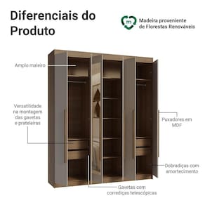 Com dobradiças com amortecimento, suas portas fecham de forma suave e silenciosa, garantindo durabilidade e conforto. As gavetas permitem abertura completa, proporcionando fácil acesso a tudo o que você precisa. O amplo maleiro é ideal para armazenar itens maiores, enquanto a possibilidade de ajustar as gavetas e prateleiras oferece total liberdade para personalizar o interior do guarda-roupa. Além disso, as portas do meio possuem espelho, agregando ainda mais funcionalidade ao móvel.