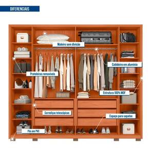 O Coari é todo em MDF, com portas de bater para um abrir e fechar otimizado, cabides em alumínio com suporte firme corrediças telescópicas nas gavetas, que deslizam rapidamente, prateleiras posicionadas conforme sua necessidade, pés de PVC e vidro reflecta nas laterais para adicionar durabilidade e sofisticação a sua decoração. Qualidade e design personalizado juntos em um único móvel, para deixar o ambiente ainda mais elegante!