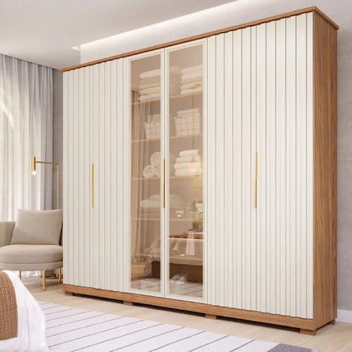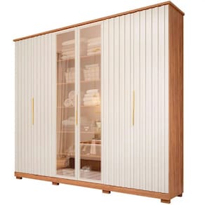 Estrutura Todo fabricado em MDF, o La Belle possui 6 portas sendo 4 delas com um lindo detalhe ripado que remete modernidade e 2 portas de vidro que completam a decoração com toque de sofisticação. Suas dobradiças de 35mm possuem o sistema de Slow Motion, um fechamento suave, assim como as corrediças das 6 gavetas que são telescópicas proporcionando maior abertura e muito mais durabilidade. Já os cabideiros são de alumínio com suporte metálico, as prateleiras bem divididas vão ajudar a organizar seus objetos de forma prática e fácil.