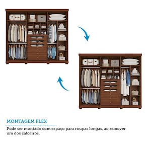 O Guarda Roupa Linhares 100% MDF agrega elegância ao seu ambiente. Possui dobradiças slow motion nas portas que proporcionam um fechamento suave, puxadores em MDF revestidos na cor do produto e gavetas com vidro temperado e corrediças telescópicas que garantem maior durabilidade. Os cabideiros são em alumínio com suportes metálicos e na montagem do lado direito é possível optar por calceiro ou espaço para roupas longas. Este produto acompanha kit com 8 pés. Acabamento da Prateleira: Pintura UV Escala de Brilho da Prateleira: Semi-Brilho Possui Cabideiros: Sim Acabamento da Gaveta: Pintura UV Escala de Brilho da Gaveta: Semi-Brilho Material do Puxador da Gaveta: Alumínio Possui Organizador de Gaveta: Não Acabamento da Porta: Pintura UV Escala de Brilho da Porta: Semi-Brilho Material do Puxador da Porta: MDF Altura dos Pés: 5 cm Altura Máxima dos Pés: 5.0000 Ambiente Principal: Quarto codigo_ean: 7900288344199 Complexidade da Montagem: Alta: deve ser montado por um montador especializado Cor: Jequitiba Cor do Produto: Jequitiba Cor Interna: Jequitibá Escala de Brilho: Semi-Brilho Espessura da Estrutura (mm): 15 mm Espessura das Portas (mm): 15 mm Espessura das Prateleiras (mm): 15 mm Espessura do Fundo (mm): 2,5 mm Espessura do Fundo das Gavetas (mm): 2,5 mm Gaveta com Chave: Não Guarda-Roupa Suporta Até (kg): 100 kg Itens Inclusos: 1 Guarda-roupas, kit ferragens e manual de montagem Linha ou Coleção: Linhares Manual de Montagem e Instalação: https://product-hub-prd.madeiramadeira.com.br/462356486/documents/f0639f44-3386-4076-8f81-328c274f94643389641368017709240116871.pdf Marca: Espresso Móveis Material da Gaveta: MDF Material da Porta: MDF Material da Prateleira: MDF Material dos Pés: ABS Material Principal: MDF modular: Não Montagem Flex: Sim, Pode Ser Montado Com 1 ou 2 Calceiros. Necessita Montagem: Sim Origem do Produto: Nacional Peso: 248,5 kg Peso Máximo por Gaveta: 5 kg Peso Máximo por Prateleira: 5 kg Possui Calceiros: 02 Possui Espelho: Não Possui Pés: 08 Possui Portas: Sim Possui Prateleiras: Sim Possui Sapateira: Não Produto Montado: Sim Quantidade de Cabideiros: 02 Cabideiros Quantidade de Gavetas: 06 Gavetas Quantidade de Prateleiras: 06 Prateleiras Recomendações de Uso, Manutenção e Limpeza: Para limpeza utilize somente pano limpo e macio, ligeiramente umidecido em água (apenas o bastante para remover a poeira), seguido de um pano seco. Sistema de Montagem: Parafusos altoatarraxantes, conjuntos minifix, cavilha madeira, acessórios plásticos/metálicos Suporta Até (kg): 100 kg Tipo de Corrediça da Gaveta: Metálica Telescópica Tipo de Dobradiça/Corrediça da Porta: Metálica Tipo de Gaveta: Interna Tipo de Guarda-Roupa: Casal Tipo de Puxador da Gaveta: Externo Tipo de Puxador da Porta: Externo