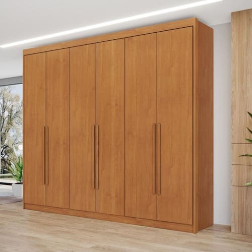 O Guarda-Roupa Casal da Conquista Móveis é uma peça robusta e funcional, perfeita para organizar o quarto com elegância. Ele conta com 6 portas, que proporcionam amplo espaço interno, e 8 gavetas com corrediças telescópicas, garantindo um deslizar suave e durabilidade. Internamente, o móvel oferece 4 nichos e 4 prateleiras, cada uma suportando até 10kg, ideais para acomodar roupas, acessórios e objetos pessoais. O cabideiro suporta até 7kg, sendo resistente para pendurar diversas peças. A estrutura é feita em MDF de 15mm, conferindo solidez e estabilidade. O guarda-roupa possui puxadores em madeira de 800mm, agregando um toque moderno ao design.