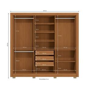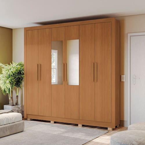 Seu quarto completo com o Roupeiro CB3M569 da Kappesberg. Com seis portas, são 2,23m de altura, 2,32m de largura e 47cm de profundidade, produzido em MDP de 15mm, garantindo robustez, firmeza e qualidade. Com até sete camadas de pintura na cor canela e acabamento touch, remetendo aos tons da natureza, dará destaque ao seu espaço. O diferencial são os espelhos, os puxadores em madeira e a moldura em torno de todo o roupeiro, deixando-o sofisticado. Na parte interna, os nichos são ideais para guardar calçados e roupas dobradas. Os cabideiros, metálicos e com suporte interno, garantem espaço para casacos e vestidos. Nas gavetas, com corrediças metálicas, você organiza acessórios e peças menores. Com pés em polipropileno, é a escolha perfeita para quem gosta de praticidade. Acabamento da Prateleira: Pintura UV Escala de Brilho da Prateleira: Fosco Possui Cabideiros: Sim Acabamento da Gaveta: Pintura UV Escala de Brilho da Gaveta: Fosco Possui Organizador de Gaveta: Não Acabamento da Porta: Pintura UV Escala de Brilho da Porta: Fosco Material do Puxador da Porta: Madeira Maciça Acabamento dos Pés: Impressão Altura do Espelho: 97 cm Altura dos Pés: 5 cm Altura Máxima dos Pés: 5.0000 Ambiente Principal: Quarto codigo_ean: 7900288156303 Complexidade da Montagem: Média: pode ser montado por mais de uma pessoa e/ou necessite de maior conhecimento para montagem Cor: Canela Cor da Porta: Marrom Cor do Produto: Canela Cor do Puxador: Marrom Escala de Brilho: Fosco Espessura da Estrutura (mm): 15 mm Espessura das Portas (mm): 15 mm Espessura das Prateleiras (mm): 15 mm Espessura do Espelho: 3 mm Espessura do Fundo (mm): 3 mm Espessura do Fundo das Gavetas (mm): 3 mm Fita Integrada: Sim Formato do Espelho: Retangular Gaveta com Chave: Não Guarda-Roupa Suporta Até (kg): 80 kg Itens Inclusos: 1 Guarda-Roupa, Ferragens e Manual de Montagem Largura do Espelho: 30 cm Linha ou Coleção: Dormitório Open Manual de Montagem e Instalação: https://product-hub-prd.madeiramadeira.com.br/890621074/documents/d8b76d99-b263-4541-a72f-a1b0395c136f29427325445174783861593.pdf Marca: Kappesberg Material da Gaveta: MDP Material da Porta: MDP Material da Prateleira: MDP Material dos Pés: Polipropileno Material Principal: MDP modular: Não Necessita Montagem: Sim Nicho com Cabideiro: Não Origem do Produto: Nacional Peso: 149,05 kg Peso Máximo por Gaveta: 6 kg Peso Máximo por Prateleira: 7 kg Porta Janelada: Não Possui Calceiros: 01 Possui Espelho: Sim Possui Pés: 08 Possui Portas: Sim Possui Prateleiras: Sim Produto Montado: Sim Quantidade de Cabideiros: 02 Cabideiros Quantidade de Espelho: 02 Espelhos com Tamanhos Iguais Quantidade de Gavetas: 03 Gavetas Quantidade de Portas com Espelhos: 2 Portas com Espelho Quantidade de Prateleiras: 08 Prateleiras Recomendações de Uso, Manutenção e Limpeza: Use um pano limpo e ligeiramente umedecido em água ou álcool (recomendamos álcool etílico hidratado). Logo após, seque a superfície com um pano seco e macio. Em grandes superfícies limpe pequenas áreas de cada vez, trabalhando de baixo para cima. Sapatas Niveladoras: Não Sistema de Montagem: Parafuso Philips e Minifix Tipo de Corrediça da Gaveta: Metálica Simples Tipo de Dobradiça/Corrediça da Porta: Metálica Tipo de Fixação do Espelho: Fita Dupla Face Tipo de Gaveta: Interna Tipo de Guarda-Roupa: Casal Tipo de Puxador da Gaveta: Abertura por Fecho Toque Tipo de Puxador da Porta: Externo