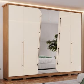 O Guarda-Roupa Casal 6 Portas Dubai é moderno e funcional, produzido em MDP com pintura UV. Possui portas com acabamento usinado, espelho, puxadores em alumínio e dobradiças com amortecimento. Conta com cabideiro em alumínio, prateleiras internas e seis gavetas com corrediças telescópicas, oferecendo ótimo espaço para organização. Os pés em ABS garantem estabilidade e praticidade no uso diário.