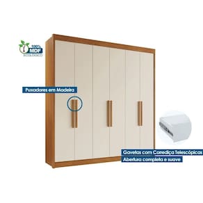 Tipo de Cabideiro - Aéreo Material dos Cabideiros - Cabideira Metálico Tipo de Porta do Guarda-Roupa - Portas de Bater Material das Portas - Portas em MDF Tipo de Dobradiças - Dobradiças Metálicas Quantidade de Portas - 6 Portas de Abrir Material das Gavetas - Gavetas em MDF Quantidade de Gavetas - 4 Gavetas Material das Prateleiras - Prateleiras em MDF Quantidade de Prateleiras - 5 Quantidade de Nichos - 2 Nichos