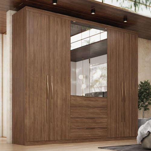 O Guarda-Roupa Casal Giardino tem estrutura produzida em MDP e revestimento em pintura UV. Acabamento Touch que proporciona a naturalidade da madeira ao toque. Cabideiros e calceiros metálicos para ampla capacidade de armazenamento. Portas com dobradiças metálicas, para mais estabilidade ao abrir e fechar. Gavetas com corrediças telescópicas, para completa abertura e movimento suave. Puxadores metálicos para maior durabilidade. Puxadores em plástico ABS que são mais fáceis de higienizar. Portas em espelhos para mais praticidade no dia a dia. Mini sapatas que evitam o atrito do móvel com o piso. Acabamento da Prateleira: Pintura UV Escala de Brilho da Prateleira: Fosco Possui Cabideiros: Sim Acabamento da Gaveta: Pintura Texturizada UV Escala de Brilho da Gaveta: Fosco Material do Puxador da Gaveta: Plástico Possui Organizador de Gaveta: Não Acabamento da Porta: Pintura Texturizada UV Escala de Brilho da Porta: Fosco Material do Puxador da Porta: Plástico Altura do Espelho: 134,6 cm Ambiente Principal: Quarto codigo_ean: 7900288150790 Complexidade da Montagem: Alta: deve ser montado por um montador especializado Cor: Nogueira Touch Cor do Produto: Nogueira Touch Cor do Puxador: Cromado Cor Flex: Não Cor Interna: Nogueira Escala de Brilho: Fosco Espessura da Estrutura (mm): 12 mm Espessura das Portas (mm): 15 mm Espessura das Prateleiras (mm): 15 mm Espessura do Espelho: 2 mm Espessura do Fundo (mm): 3 mm Espessura do Fundo das Gavetas (mm): 3 mm Formato do Espelho: Retangular Gaveta com Chave: Não Guarda-Roupa Suporta Até (kg): 64 kg Informações Complementares: As cores do produto podem sofrer variações de tonalidade de acordo com as configurações do seu dispositivo. Itens Inclusos: 1 Guarda-Roupa, Kit Ferragens e Manual de Montagem Largura do Espelho: 43,2 cm Linha ou Coleção: Giardino Manual de Especificação Técnica: https://product-hub-prd.madeiramadeira.com.br/641488935/documents/c53fc5ee-9b11-455c-90c5-5fb630c316373016763302817508550809739.pdf Manual de Montagem e Instalação: https://product-hub-prd.madeiramadeira.com.br/641488935/documents/f7bc099b-114f-4d13-a891-e738752b0fe13016762302817508550772963.pdf Marca: Demóbile Material da Gaveta: MDP Material da Porta: MDP Material da Prateleira: MDP Material Principal: MDP modular: Não Montagem Flex: Não Necessita Montagem: Sim Nicho com Cabideiro: Não Origem do Produto: Nacional Peso: 178,55 kg Peso Máximo por Gaveta: 3 kg Peso Máximo por Prateleira: 4 kg Porta Janelada: Não Possui Calceiros: 01 Possui Capelinha: Não Possui Espaço para Vestidos Longos: Não Possui Espelho: Sim Possui Espelho Interno: Não Possui Ganchos: Não Possui iluminação: Não Possui Painel de TV: Não Possui Penteadeira: Não Possui Pés: Não Possui Portas: Sim Possui Prateleiras: Sim Possui Sapateira: Não Produto Montado: Sim Quantidade de Cabideiros: 02 Cabideiros Quantidade de Espelho: 02 Espelhos com Tamanhos Iguais Quantidade de Gavetas: 04 Gavetas Quantidade de Portas com Espelhos: 2 Portas com Espelho Quantidade de Prateleiras: 06 Prateleiras Recomendações de Uso, Manutenção e Limpeza: Utilizar flanela seca. Sistema de Montagem: Parafusos/Cavilhas Suporta Até (kg): 64 kg Tipo de Corrediça da Gaveta: Metálica Telescópica Tipo de Dobradiça/Corrediça da Porta: Metálica Tipo de Fixação do Espelho: Fita Dupla Face Tipo de Gaveta: Externa Tipo de Guarda-Roupa: Casal Tipo de Puxador da Gaveta: Externo Tipo de Puxador da Porta: Externo