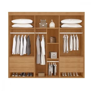 Características: 6 Portas 6 Gavetas Acabamento em pintura UV Espaço interno ele e ela Puxadores em madeira Estrutura 100 MDF Corrediças telescópicas Calceiro e cabideiro em alumínio Perfil H em MDF Detalhe frisado nas portas