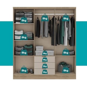 Especificações do Guarda Roupa: Medidas totais: Largura: 180 cm | Altura: 206 cm | Profundidade: 46,5 cm Peso total: 90,6 Kg