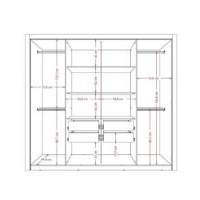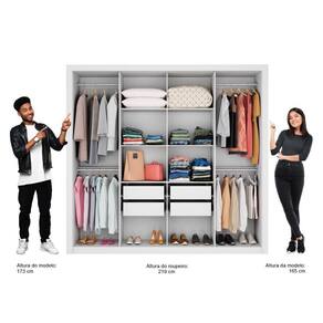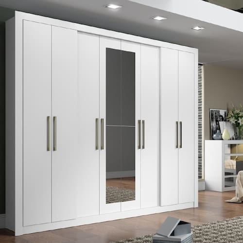O Guarda-Roupa Héster é espaçoso e robusto. Externamente possui 8 portas de batente, sendo as 2 centrais revestidas por espelho. Possui detalhe de recuo nas 4 portas centrais, proporcionando volumetria ao produto. Internamente conta com divisão ele/ela e 4 gavetas para guardar roupas e objetos de menor volume. Além disso, contém espaço para armazenar roupas em cabideiros ou dobradas em prateleiras.