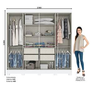 FICHA TÉCNICA ROUPEIRO: Acabamento: Pintura UV Cor Interna: Trama Branco Escala de Brilho: Brilho Material do Fundo: MDF Possui Espaço para Vestidos Longos: Sim Possui Ganchos: Não Possui Iluminação Led: Não Possui Maleiro: Não Possui porta Objetos: Não Qtd. Portas: 8 Und. Tipo Porta: Bater Material da Porta: MDP Material da Dobradiça: Metálica Material do Puxador Porta: ABS Qtd. Gavetas: 4 Und. Material da Gaveta: MDP/MDF Material da Corrediça: Metálica Material do Puxador Gaveta: Não Possui, fechamento através da própria gaveta Peso Máximo por Gaveta: 3 KGs Possui Organizador de Gaveta: Não Qtd. Prateleiras: 3 Und. Material da Prateleira: MDP Peso Máximo por Prateleira: 8 KGs Possui pés: 10 Und. Material dos Pés: ABS Altura Pés/Rodapés: 5 Cm Pés Reguláveis: Não Possui Espelho: Não Material do Cabideiro: Madeira Material do Calceiro: Madeira Produto Suporte até -Kg-: 124 Kg Material Principal: MDP Medidas Montado: 220 x 216 x 46,5 Cm Peso Montado: 124 Kg
