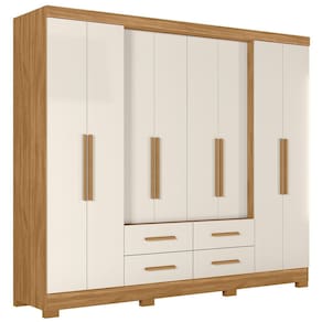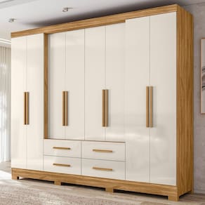 Um lindo Guarda-Roupa com uma ótima divisão ele / ela, tendo pés em PVC, 4 gavetas com corrediças telescópicas, bastões em alumínio, puxadores com acabamento cromado, acabamento em impressão UV relevo fosco e com portas centrais recuadas.! Acabamento da Prateleira: Impressão Escala de Brilho da Prateleira: Semi-Brilho Possui Cabideiros: Sim Acabamento da Gaveta: Impressão Escala de Brilho da Gaveta: Fosco Material do Puxador da Gaveta: Plástico Possui Organizador de Gaveta: Não Acabamento da Porta: Impressão Escala de Brilho da Porta: Fosco Material do Puxador da Porta: Plástico Acabamento dos Pés: Poliéster Altura do Espelho: 60 cm Altura dos Pés: 5 cm Altura Máxima dos Pés: 5.0000 Ambiente Principal: Quarto codigo_ean: 7900288230034 Complexidade da Montagem: Média: pode ser montado por mais de uma pessoa e/ou necessite de maior conhecimento para montagem Cor: Freijó/Off White Cor do Produto: Freijó/Off White Cor Interna: Freijó Escala de Brilho: Semi-Fosco Espessura da Estrutura (mm): 15 mm Espessura das Portas (mm): 15 mm Espessura das Prateleiras (mm): 12 mm Espessura do Espelho: 3 mm Espessura do Fundo (mm): 3 mm Espessura do Fundo das Gavetas (mm): 3 mm Formato do Espelho: Retangular Itens Inclusos: 1 Guarda-Roupa, Kit Ferragens e Manual de Montagem Largura do Espelho: 21 cm Linha ou Coleção: San Lorenzo Manual de Montagem e Instalação: https://product-hub-prd.madeiramadeira.com.br/992340/documents/c01ead2d-aa95-4ec9-961f-d471bb9782bd2953751635017482848416329.pdf Marca: Moval Material da Gaveta: MDP Material da Porta: MDP Material da Prateleira: MDP Material dos Pés: PVC Material Principal: MDP modular: Não Montagem Flex: NÃO Necessita Montagem: Sim Origem do Produto: Nacional Peso: 145,54 kg Peso Máximo por Gaveta: 6 kg Peso Máximo por Prateleira: 6 kg Possui Calceiros: 01 Possui Espaço para Vestidos Longos: Não Possui Espelho: Sim Possui Espelho Interno: Não Possui Ganchos: Não Possui Painel de TV: Não Possui Pés: 08 Possui Portas: Sim Possui Prateleiras: Sim Possui Sapateira: Sim Produto Montado: Sim Quantidade de Cabideiros: 02 Cabideiros Quantidade de Espelho: 04 Espelhos com Tamanhos Iguais Quantidade de Gavetas: 04 Gavetas Quantidade de Portas com Espelhos: 2 Portas com Espelho Quantidade de Prateleiras: 09 Prateleiras Recomendações de Uso, Manutenção e Limpeza: Limpeza deve ser realizada com pano macio e seco, não utilizar produtos abrasivos Sistema de Montagem: Parafusos, cavilhas e girofix Suporta Até (kg): 122 kg Tipo de Corrediça da Gaveta: Metálica Telescópica Tipo de Dobradiça/Corrediça da Porta: Metálica Tipo de Fixação do Espelho: Parafusos Tipo de Gaveta: Externa Tipo de Guarda-Roupa: Casal Tipo de Puxador da Gaveta: Externo Tipo de Puxador da Porta: Externo