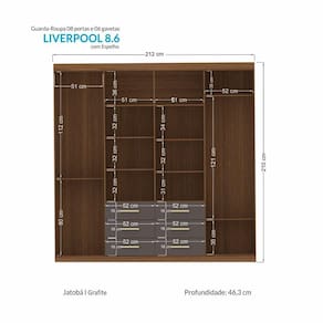 O Guarda Roupa Liverpool da Santos Andirá é um móvel prático e funcional, e se encaixa em qualquer ambiente do quarto de casal ou solteiro. Com 8 portas e 6 gavetas, esse roupeiro garante muito espaço para guardar todas as roupas. Puxadores em ABS garantem um design moderno. Internamente, possui amplas prateleiras para guardar todas as roupas de forma organizada, assim como edredons, cobertores, caixas, travesseiros, decoração, etc.