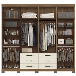 10 amplas prateleiras para guardar as roupas que precisam ser dobradas e decoração.