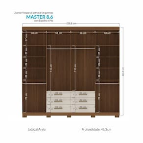 Possui pés em PVC, que permitem elevar o móvel do chão, facilitando a limpeza embaixo dele. Acabamento da Prateleira: Pintura Escala de Brilho da Prateleira: Semi-Fosco Possui Cabideiros: 02 Acabamento da Gaveta: Pintura Escala de Brilho da Gaveta: Semi-Fosco Material do Puxador da Gaveta: ABS Possui Organizador de Gaveta: Não Acabamento da Porta: Pintura Escala de Brilho da Porta: Semi-Fosco Material do Puxador da Porta: ABS Acabamento dos Pés: Pintura Altura do Espelho: 95 cm Altura dos Pés: 5 Altura Máxima dos Pés: 5.0000 Ambiente Principal: Quarto codigo_ean: 7909903490372 Complexidade da Montagem: Média: pode ser montado por mais de uma pessoa e/ou necessite de maior conhecimento para montagem Cor: Jatobá/Areia Cor do Produto: Jatobá/Areia Cor Flex: Não Cor Interna: Jatobá Escala de Brilho: Semi-Fosco Espessura do Espelho: 3 mm Fita Integrada: Sim Formato do Espelho: Retangular Gaveta com Chave: Não Informações Complementares: Para garantir a qualidade do produto dentro da embalagem, as caixas são revestidas por um plástico termoencolhível e todas as peças externas são separadas por isomanta, tudo para preservar e evitar o atrito entre as peças dentro da embalagem. Você contará Itens Inclusos: 1 Guarda Roupa, Kit Ferragens e Manual de Montagem Largura do Espelho: 23 cm Linha ou Coleção: Master Manual de Especificação Técnica: https://product-hub-prd.madeiramadeira.com.br/879822/documents/7888215c-a233-460c-9ece-d0fd95a9fd3b1664118152443ep.pdf Manual de Montagem e Instalação: https://product-hub-prd.madeiramadeira.com.br/879822/documents/6652639b-2e0c-4383-862c-d22ef2e2fa9b166411794923206grmaster86.pdf Material da Gaveta: MDP Material da Porta: MDP Material da Prateleira: MDP Material dos Pés: PVC Material Principal: MDP modular: Não Montagem Flex: Não Necessita Montagem: Sim Origem do Produto: Nacional Peso: 147,35 kg Peso Máximo por Gaveta: 3 kg Peso Máximo por Prateleira: 3 kg Possui Calceiros: 02 Possui Espaço para Vestidos Longos: Não Possui Espelho: Sim Possui Espelho Interno: Não Possui Ganchos: Não Possui iluminação: Não Possui Nichos: Não Possui Painel de TV: Não Possui Pés: 10 Possui Portas: Sim Possui Prateleiras: Sim Possui Sapateira: Não Produto Montado: Sim Quantidade de Espelho: 04 Espelhos com Tamanhos Iguais Quantidade de Gavetas: 06 Gavetas Quantidade de Prateleiras: 10 Prateleiras Recomendações de Uso, Manutenção e Limpeza: Pano levemente úmido e flanela. Sapatas Niveladoras: Não Sistema de Montagem: Parafusos e Cavilhas Tipo de Corrediça da Gaveta: Metálica Telescópica Tipo de Dobradiça/Corrediça da Porta: Metálica Tipo de Fixação do Espelho: Fita Dupla Face Tipo de Gaveta: Externa Tipo de Guarda-Roupa: Casal Tipo de Puxador da Gaveta: Externo Tipo de Puxador da Porta: Externo