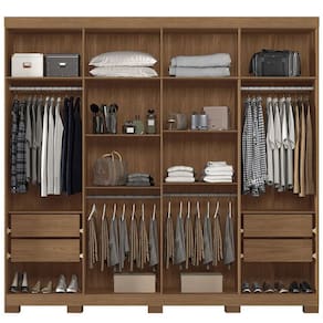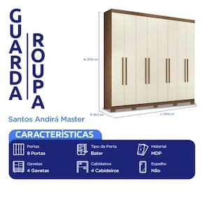 São 8 portas e 4 gavetas internas com corrediças metálicas, sua divisão interna conta com 10 prateleiras super espaçosas, além dos cabideiros e calceiros, que são em alumínio. E olha que demais, este modelo da Santos Andirá, possui um maleiro amplo. Espaço é o que não falta, não é mesmo?