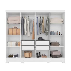 Feito em MDP, com quatro gavetas com corrediças metálicas, possui seis prateleiras amplas e espaçosas podem ser utilizadas para guardar edredons, cobertores, caixas e sapatos