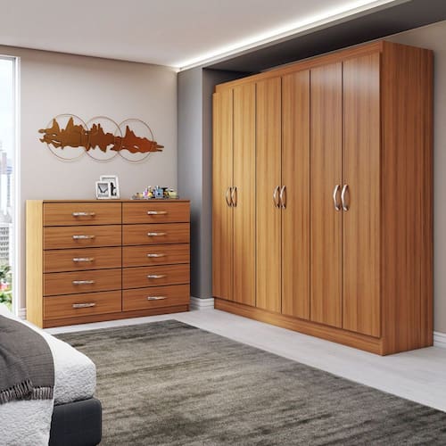 O(a) Guarda-Roupa Casal Aiden 6 Portas 2 Gavetas com Cômoda 10 Gavetas Cinamomo - Loja é produzido em MDP na escala de brilho Semi-Brilho, e possui um grau de dificuldade de montagem: Médio.