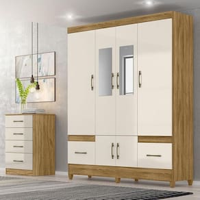 Guarda Roupa Casal Ambiente MS912 com espelho e Cômoda MS913 Freijó Off White Moval