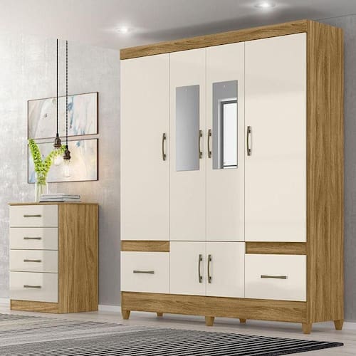 Organize seu quarto com elegância e o melhor custo benefício do mercado. Apresentamos o Guarda Roupa Casal MS912 e Cômoda MS913 fabricados pela Moval. Guarda Roupa possui 06 portas sendo as centrais com espelho, 02 gavetas com corrediças metálicas, puxadores em MDF, cabideiros em alumínio para melhor organização interna e pés em PVC. A cômoda possui 04 gavetas sendo a ultima maior com corrediças metálicas e puxadores na cor bronze. Fabricado com materiais de alta qualidade que garante resistência e durabilidade ao produto. Confira mais detalhes e aproveite!