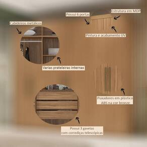 O Guarda Roupa Sumatra desenvolvido pela Demóbile irá te encantar! Sua estrutura em MDP super reforçado garante muito mais qualidade e durabilidade do móvel, conta com 6 portas, 3 gavetas, maleiro espaçoso e varias prateleiras internas com espaços bem distribuídos para uma boa acomodação de roupas e objetos. Seu design super moderno, valoriza e muito charme e elegância ao ambiente, tornando perfeito para você. Confira e aproveite!