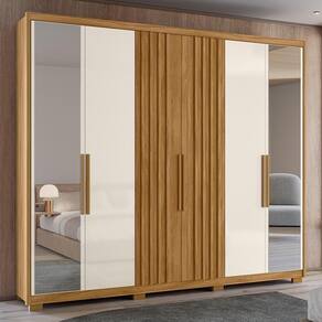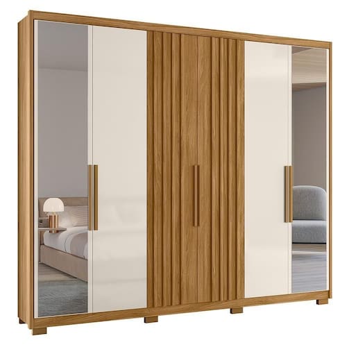 Guarda Roupa Casal Araguaia Ripado 6 Portas Freijó/off White Com Espelho - Moval Freijó/off White Guarda Roupa Casal Araguaia Ripado 6 Portas com Espelho - Moval O Guarda-Roupa Casal Araguaia Ripado 6 Portas é perfeito para quem valoriza espaço e elegância. Com estrutura em MDP e pintura UV, oferece resistência e um acabamento sofisticado. Possui 6 portas, incluindo 2 com detalhes ripados em MDF, que acrescentam um toque moderno ao design. Internamente, dispõe de prateleiras, 4 gavetas com corrediças telescópicas para organização eficiente e um cabideiro para suas roupas. As molduras laterais de 25mm e os puxadores em MDF complementam o visual, enquanto os pés em PVC garantem estabilidade. Ideal para transformar seu quarto em um ambiente funcional e elegante. ESPECIFICAÇÕES: - Estrutura em MDP - Pintura UV - 6 Portas sendo 2 portas com detalhe ripado em MDF - Dobradiças metálicas - Interna com prateleiras - 4 Gavetas - Corrediças telescópicas - Cabideiro - Molduras laterais em 25mm - Puxadores em MDF - Espelhos nas portas centrais - Pés em PVC