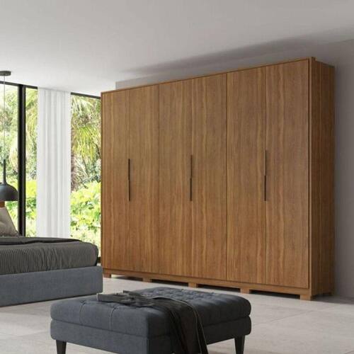 Características Técnicas:- Desenvolvido em MDP- Pintura e acabamento em U.V na cor Amêndola- Possui 06 Portas- Possui 06 Gavetas- Gavetas com Corrediças Telescópicas livres de qualquer enrosco- Puxadores em Alumínio- Incluso 03 Maleiros- 04 Prateleiras Internas- Possui 03 cabideiros metálicos- Kit com 10 Pés- Maior organização, espaço e praticidade- Lindo DesignDimensões:Altura: 230 cmLargura: 267 cmProfundidade: 55 cm