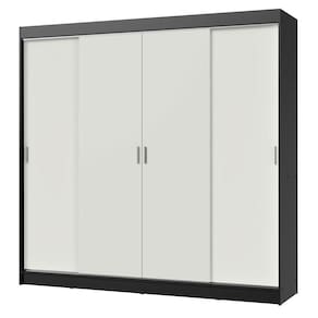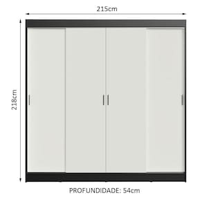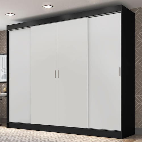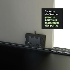 O móvel conta com quatro portas de correr com deslizamento suave, trilhos em alumínio para maior resistência e quatro puxadores externos. Além disso, o sistema anti-descarrilhamento evita com que as portas saiam do trilho e transmitem mais segurança no uso diário.