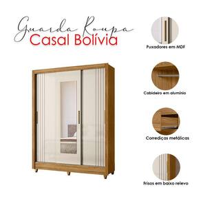 Organize seu quarto com elegância e o melhor custo benefício do mercado. Apresentamos o Guarda Roupa Casal Bolívia e Cômoda Vênus fabricados pela Moval. Guarda Roupa possui três portas deslizantes, sendo a porta central com espelho, as duas portas laterais apresentam frisos em baixo relevo, com trilhos em alumínio garantindo um deslizamento suave, duas gavetas equipadas com corrediças metálicas, puxadores em MDF, cabideiro e calceiros em alumínio para melhor organização interna e pés em PVC. A cômoda possui 04 gavetas, com corrediças metálicas, 01 porta, detalhes frisados, pés em PVC e puxadores em MDF. Fabricado com materiais de alta qualidade que garante resistência e durabilidade ao produto. Confira mais detalhes e aproveite!