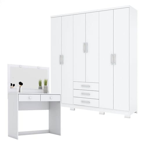 Na hora de decorar seu quarto, escolha móveis que vão unir sofisticação e praticidade! Apresentamos o Guarda Roupa Casal Caju 6 Portas e Penteadeira Daila com Led, desenvolvidos pela Henn. O Guarda Roupa Caju conta com 6 portas, 3 gavetas com corrediças metálicas e cabideiros de madeira resistentes e revestidos. A penteadeira possui Leds acima do espelho, 2 gavetas com corrediças metálicas e design moderno. Todos os móveis são produzidos com materiais de alta qualidade que garantem durabilidade e o melhor custo benefício! Confira mais detalhes e aproveite.