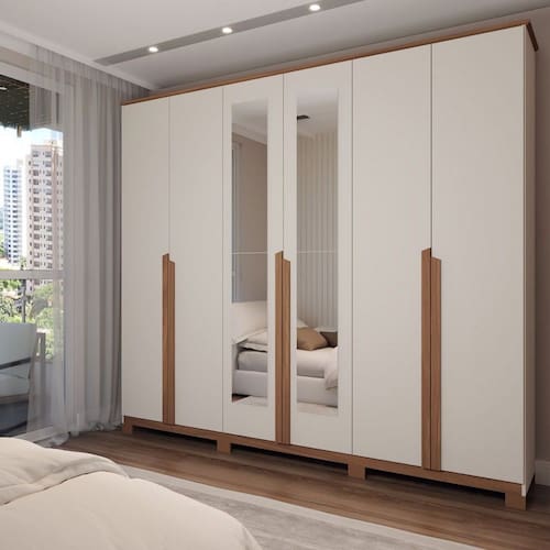 O(a) Guarda-Roupa Casal Calábria 6 Portas 6 Gavetas Espelho Nature/Off White - Loja é produzido em MDP na escala de brilho Brilho e Fosco, e possui um grau de dificuldade de montagem: Médio.