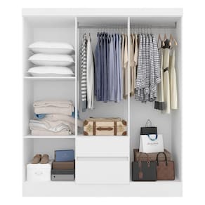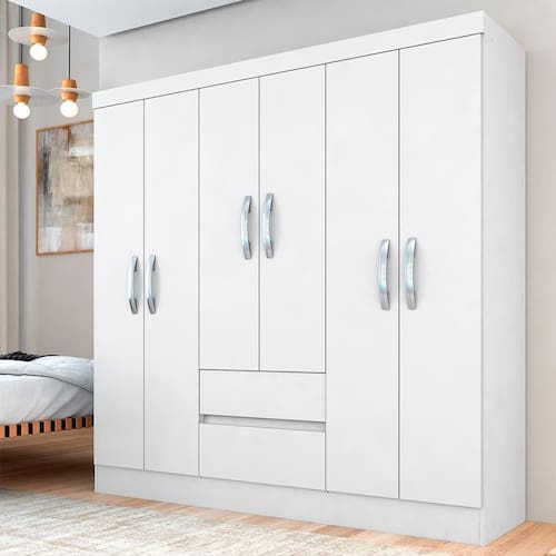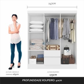Procurando simplicidade e beleza em um guarda-roupa? O Roupeiro Cancún foi pensado para você! Fabricado com materiais de qualidade e com um design impecável é um móvel necessário que pode encantar ainda mais o seu ambiente!Medidas do Guarda-Roupa Montado: A: 180cm | L: 147cm | P: 40cm- Chapa MDP 12mm- Corrediça Metálica- Tonalidade: Branco- Dobradiça Metálica- Cabideiro de Madeira- Pés em PVC- Puxadores em PVC- Estruturado com material de altíssima qualidade, evitando fungos e mofo.Conteúdo da Embalagem:- 01 Guarda-Roupa- Plástico protetor- Caixa papelão- Acessório para MontagemObservações Importantes:- As imagens ambientadas são meramente ilustrativas e podem apresentar itens que não incorporam o produto;- Todos os nossos produtos são novos, acompanham documento fiscal e possuem garantia de 3 meses, essa garantia cobre somente defeitos de fabricação;- A entrega só será efetuada no endereço do CEP, caso o endereço seja diferente do CEP informado no pedido, a entrega terá cobrança adicional e o comprador arcará com as despesas;- Não realizamos entregas para zonas rurais, via caminhos fluviais e distritos, por isso não aceitamos CEP GERAL da região;- Não é possível realizar o agendamento de entrega do produto, é necessário que acompanhe o rastreio de seu pedido para saber a previsão de entrega;- As entregas somente serão realizadas para um responsável maior de idade (+18);- Enviamos para diversos estados, sendo assim nossas entregas são realizadas por transportadoras parceiras de nossa empresa. Confira as dimensões antes da compra e certifique-se de que o produto passará por elevadores, portas e corredores já que nossa entrega não inclui a subida de lances de escada, transporte por elevador e o lançamento de produtos, em caso de condomínios residenciais a entrega é feita somente até a portaria. Todas as entregas são realizadas em dias e horários comerciais;- Ao receber os seus produtos observe se a embalagem se encontra em perfeitas condições. Se você adquiriu algum móvel, confira atentamente a quantidade de volumes e o aspecto físico das embalagens. Confira também se a cor do móvel está de acordo com o seu pedido;- O prazo de cancelamento por arrependimento é de até 7 dias corridos a contar da data de recebimento;- Os produtos e assistências são enviados DESMONTADOS, MONTAGENS E DESMONTAGENS recomendamos sempre a contratação de um montador profissional e é válido lembrar que o custo desses serviços é por conta do comprador;- Objetos decorativos que aparecem na foto não acompanham o produto;- Evitar a exposição direta à luz solar e à umidade;- Para limpeza, limpar com pano macio e seco, não utilizar qualquer outro tipo de produtos químicos;- As cores do produto podem variar de acordo com o monitor, a iluminação do ambiente ou sua percepção visual;