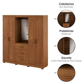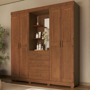 Madeira Maciça TaedaGuarda Roupa Casal 1143C, organização versátil e robusta com um charme rústico que envolve o ambiente! Com estrutura 100% em Madeira Maciça Taeda de 13/14 mm (presença calorosa, toque orgânico) e acabamento em pintura brilho 10%. Inclui portas com detalhes usinados como moldura, dobradiças metálicas e puxadores em madeira maciça. Bem como gavetas externas com corrediças telescópicas (superior possui fechadura por chave) e capela central com espelho e prateleiras decorativas funcionais. Além de amplas prateleiras internas, cabideiros em alumínio e pés retos também em Madeira Maciça (65 mm). Produto será entregue em 04 volumes.