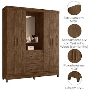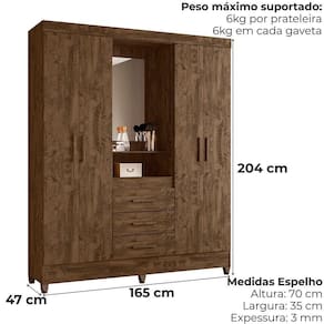 Moderno e versátil, o Guarda Roupa Casal Capri foi desenvolvido para otimizar espaços com eficiência. Estrutura em MDP (15/ 12 mm) e acabamento em pintura UV. Possui capela central com espelho e prateleira, portas com dobradiças metálicas, cabideiro interno (alumínio) e gavetas com corrediças metálicas. Produto com dupla opção de montagem: pés em PVC ou sapatas plásticas (2 mm) conforme preferência do cliente. Este produto será entregue em 03 volumes.