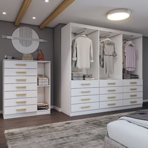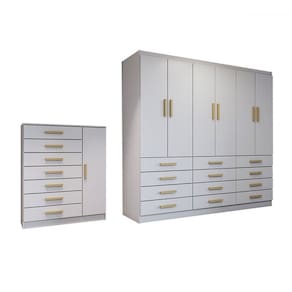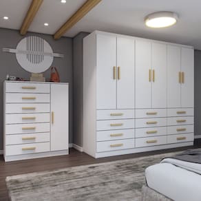 O(a) Guarda-Roupa Casal Catedral 6 Portas 12 Gavetas e Cômoda 1 Porta 7 Gavetas Branco - Loja é produzido em MDP na escala de brilho Semi-Fosco, e possui um grau de dificuldade de montagem: Médio.