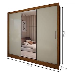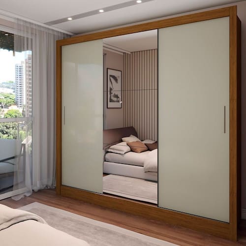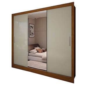 O(a) Guarda-Roupa Casal Colie 3 Portas 3 Gavetas com Espelho Cinamomo/Off White - Loja é produzido em MDP na escala de brilho Fosco e Semi-Brilho, e possui um grau de dificuldade de montagem: Médio.
