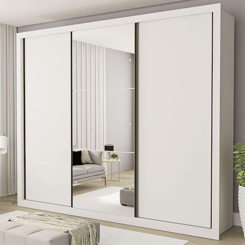 Guarda Roupa Casal Com 3 Espelhos 3 Portas Minastex Branco Com muito charme e elegancia, o Guarda-Roupa veio para transformar o seu espaco de uma vez por todas! De design classico ele conta com um espaco interno perfeito para manter a organizacao e o visual do seu comodo sempre em dia. Um quarto do jeitinho que voce sempre quis? Nos temos o movel certo! Caracteristicas: Tipo de Guarda-roupa: Casal Ambiente Principal: Quarto Estilo: Moderno Material Principal: MDP Acabamento: Pintura Escala de Brilho: Brilhante Possui Portas: Sim Tipo de Porta: Correr Possui Gavetas: Sim Tipo de Gaveta: Interna Possui Calceiros: Sim Possui Cabideiros: 03 Quantidade de Portas: 03 Quantidade de Gavetas: 06 Quantidade de Prateleiras: 11 Formato do Espelho: Retangular Possui Prateleiras: Sim Quantidade de Espelhos: 03 Espelhos com Tamanhos Iguais Complexidade da Montagem: Alta: deve ser montado por um montador especializado Tipo de Puxador da Porta: Embutido Tipo de Puxador da Gaveta: Embutido Tipo de Fixacao do Espelho: Parafusos Tipo de Corredica da Gaveta: Metalica Telescopica Material do Puxador da Porta: Plastico Tipo de Dobradica/Corredica da Porta: Aluminio Possui Espelhos: Sim Necessita Montagem: Sim Possui Espaco para Vestidos Longos: Sim Sistema de Montagem: Parafusos e Minifix Espessura do Espelho: 3 mm Peso Maximo por Gaveta: 10 kg Peso Maximo por Prateleira: 5 kg Guarda-Roupa Suporta Ate: 90 kg Origem do Produto: Gaveta com Chave: Nao Possui Painel de : Nao Gaveta com Divisores: Nao Possui Espelho Interno: Nao Possui Organizador de Gaveta: Nao Possui Sapateira: Nao Possui Pes: Nao