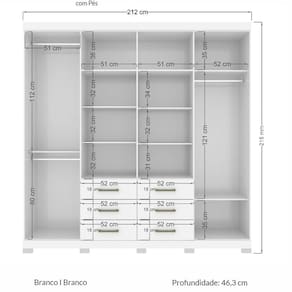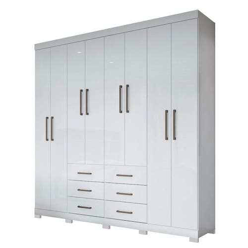 Ah, não há nada melhor do que decorar a casa do nosso jeitinho. Não é mesmo? Só que o melhor disso, é se além da decoração ser agradável, a funcionalidade dos itens escolhidos seja igualmente boa. Para isso, a Santos Andirá desenvolveu o Guarda Roupa Liverpool Branco, confira!Ele é um guarda roupa 8 portas, ou seja, excelente para quem ocupa muito espaço. As portas possuem dobradiças metálicas, mas ele também conta com 6 gavetas de amplo espaço interno, 3 cabideiros e várias prateleiras formando nichos com espaço suficiente para ajudar a organizar suas roupas. Ah, e todo fabricado em MDP/MDF, pés em madeira e com acabamento em verniz fosco para maior durabilidade e resistência!Resumindo: um item imperdível para quem gosta de organização e estilo!!Não perca tempo, adicione agora mesmo esse guarda roupa casal ao seu carrinho de compras!!Dimensões do ProdutoLargura: 212 cm.Altura: 210 cm.Profundidade: 46,3 cm.Peso: 130,50 Kg.Características do ProdutoMaterial da Estrutura: MDP.Peso Suportado: Gaveta: 3 Kg / Base: 5 Kg / Prateleiras Menores: 3 Kg / Prateleiras Maiores: 5 Kg / Prateleira Dupla: 8 Kg.Acabamento: Verniz UVEscala de Brilho: Brilhante.Quantidade de Portas: 8 Portas.Possui Espelho: Não.Quantidade de Gavetas: 6 Gavetas.Tipo de Corrediças: Metálicas.Tipo de Puxador: ABS.Possui Cabideiro: Sim.Quantidade de Cabideiros: 3 Cabideiros.Possui Prateleiras: Sim.Quantidade de Prateleiras: 9 Prateleiras.Possui Pés: Sim.Diferenciais:- Design Moderno.- Puxador na cor metálica.- Amplo maleiro.Sistema de Montagem: Cavilhas / Parafusos / Girofix.Manual de Montagem: Sim.Complexidade da Montagem: Alta.Volumes: 4 Volumes.Garantia do Fabricante: 90 dias contra defeito de fabricação.Montagem: Recomendamos que seja feita por um profissional.Recomendação de Limpeza: Utilize pano levemente úmido.Observações importantes:- Produto para uso residencial em ambiente interno, não devendo ficar exposto diretamente ao sol, calor e umidades excessivas.- Pode haver alguma diferença de tonalidade entre a imagem e o produto real, por conta do tratamento de imagens e a calibração de cores do seu monitor.- As imagens são meramente ilustrativas, não acompanham objetos de decoração e eletrônicos.- Confira o estado da embalagem, não devendo assinar o comprovante em caso de danos.- Não asseguramos, no ato da entrega, por subir escadas/elevadores, pelo transporte por guincho em apartamentos ou montagem, desmontagem e instalações. Eventuais despesas são por conta do comprador.- Confira as dimensões do produto e certifique-se de que passará normalmente por supostos elevadores, portas, escadas e/ou corredores de sua residência.