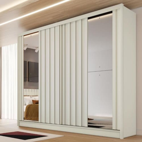 Características: Estrutura em MDF Acabamento em Pintura UV 2 Portas de correr 4 Gavetas Corrediças telescópicas Ripado Espelho Puxador embutido
