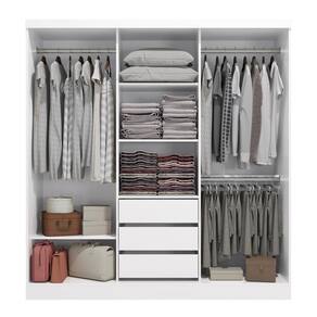 Cabideiro: Metálicos | Cor: Branco | Corrediças: Telescópicas | Garantia: 3 meses para defeito de fabricação | Gavetas: Internas | Matéria-prima: MDP | Peso suportado por cada prateleira: 7 kg | Peso suportado por gaveta: 6 kg | Puxadores: Metálicos | Quantidade de gavetas: 3 | Quantidade de portas: 3 | Quantidade de prateleiras: 5 | Sistema de montagem: Parafuso Philips e Minifix | Tipo de porta: Correr