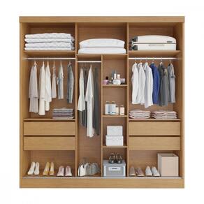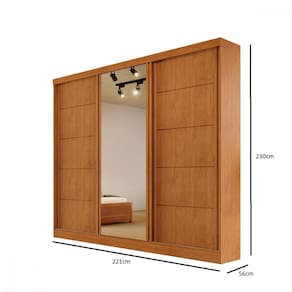 O roupeiro Capri combina funcionalidade e elegancia em um design robusto e bem estruturado. Fabricado com materia prima de alta qualidade em 100 MDF, oferece um amplo espaco interno organizado pelo sistema ELE e ELA, ideal para atender suas necessidades de armazenamento. Com tres portas deslizantes equipadas com puxadores em MDF, quatro gavetas internas com corredicas telescopicas para facilidade de uso, e costas inteiras para maior durabilidade. Possui um nicho organizador com tres prateleiras centrais bem distribuidas, alem de espaco dedicado para roupas longas, cabideiros em aluminio e uma porta central com espelho inteiro, protegido por pelicula de seguranca. E uma escolha perfeita para quem busca praticidade sem abrir mao do estilo.